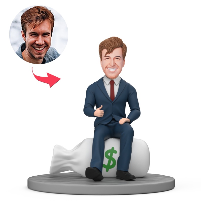 Man Sitting on Money Bag Custom Bobblehead with Engraved Text